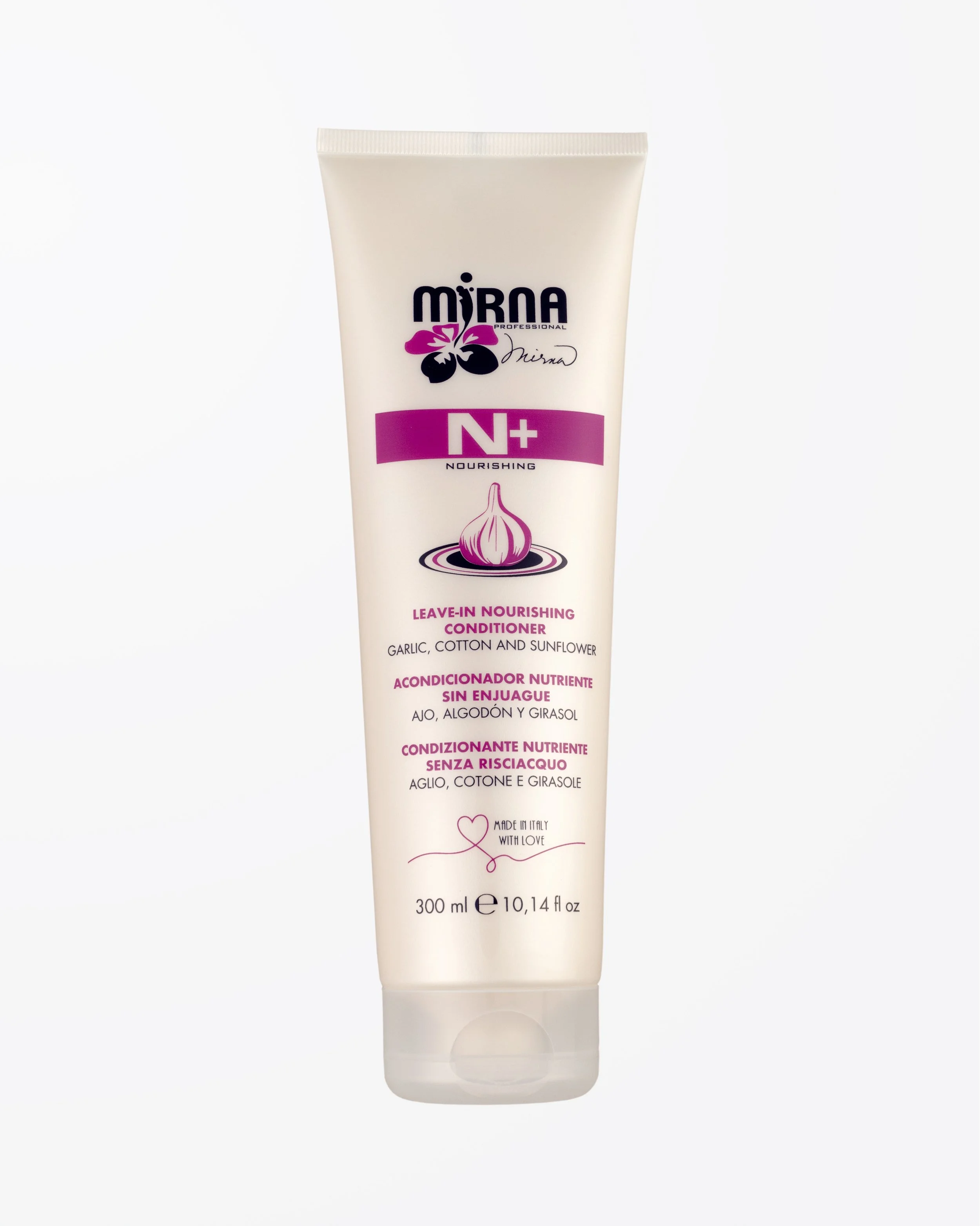 A tube of Mirna N+ Nourishing Leave-in Conditioner with garlic, cotton, and sunflower ingredients, made in Italy, 300 ml (10.14 fl oz).