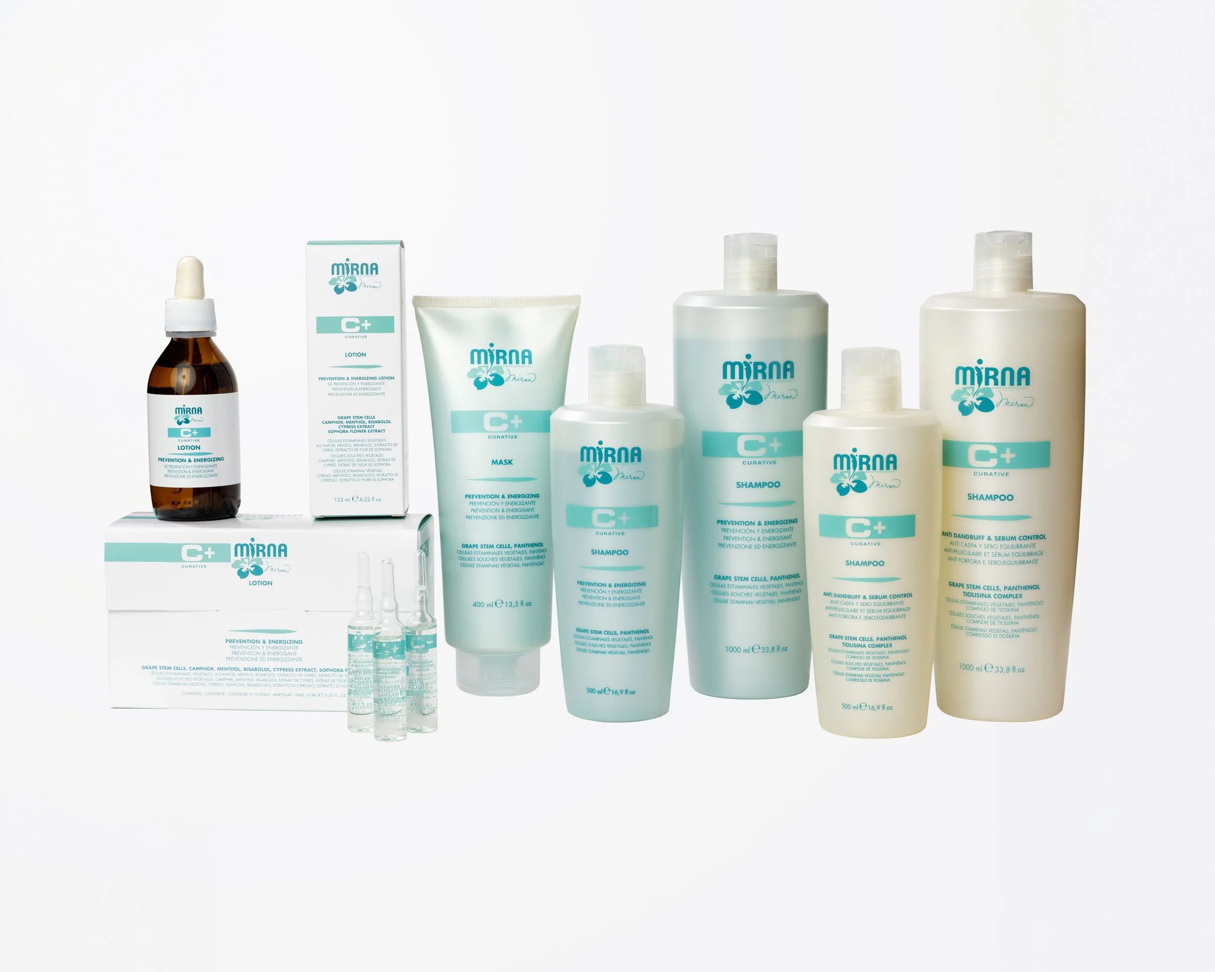 Bottle and box of Mirna C+ curative lotion with dropper top, labeled as prevention and energizing, with ingredients listed, against a white background.